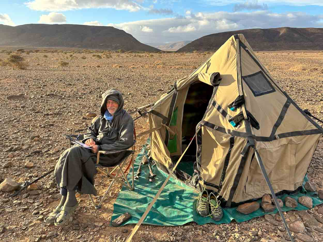 Dans cette plaine anthracite, parfois des sortes de « sebkha » dépressions blanches, lissées par l’eau de pluie laissent une étrange plaine écrue – blanche. Nous nous rapprochons du Jbel Bani et l’échancrure de Khenga Ali nous indique le lieu du bivouac, proche d’une citerne d’eau « Tanoute-fi ». Les acacias disséminés dans l’oued Khenga, un peu grisâtres sont la pâture de nos dromadaires.