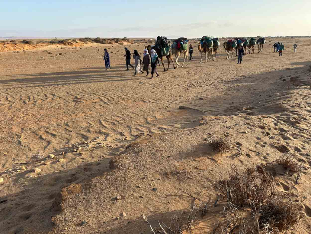 Demain retour pour Jean-Bernard, Anna et Colin en véhicule pour Tantan d’où ils prendront le bus pour Agadir et Marrakech. Le camion venu aussi de Ouarzazate nous amène le ravitaillement des vingt prochains jours. Il repart demain avec trois dromadaires, un peu de matériel, Mohamed et Ychou. Le pickup assistance reste avec Kassi et Rachid venus remplacer Ychou pour des ravitaillements réguliers, car le pâturage est inexistant. Peu de points d’eau sur ce parcours plus engager que la première partie.