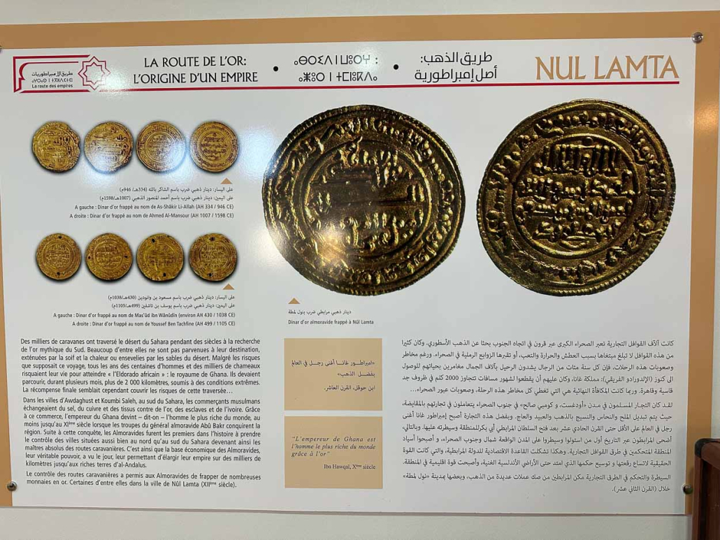 Quelques kilomètres en véhicule pour rejoindre le village d’Asrir, et notre caravane de dromadaires aux ruines de NÛL LAMTA, proche de Guelmim, vestige de l’ancienne cité médiévale Nûl Lamta ou également nommée la forteresse d’Agwidîr. Si M’bark Moutik, responsable de la culture au conseil communal d’Asrir, nous accueil pour visiter l’exposition réalisée par le centre Jacques Berques à Rabat en 2022.