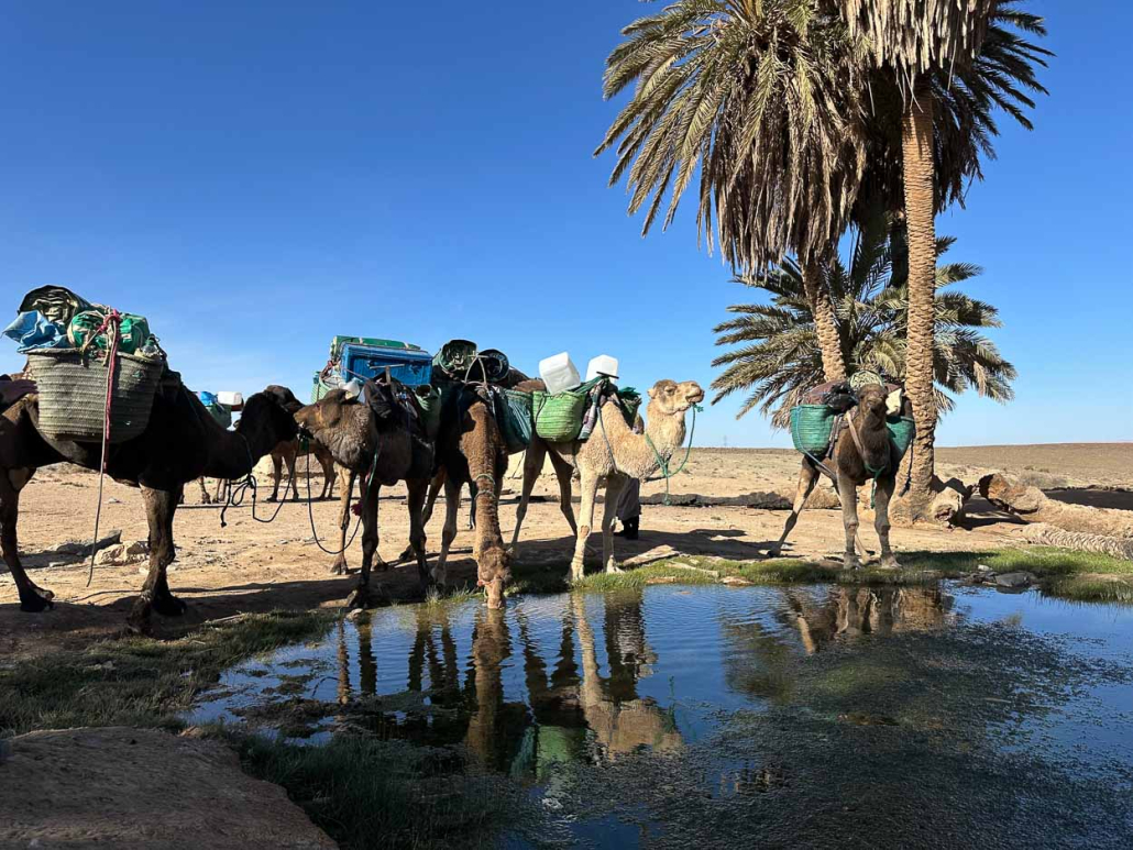 Nos dromadaires et les chameliers sont arrivés il y a quelques jours ici en camion depuis l’Est de Zagora du désert de Maïdr, une journée et une nuit entière de route.Des salutations de joie s’échangent avec l’équipe des chameliers et nos amis voyageurs, qui ont déjà réalisé ensemble plusieurs longues traversées dans l’Atlas où le désert.La grande aventure démarre à l’instant, ce projet je l’ai imaginé devant une carte il y a plus de dix ans. C’est un moment chargé d’émotions pour moi également, et je suis très heureux de vous le partager.Yallah ! direction la source sacrée où nous effectuons un petit détour, pour emmener les chameaux boire l’eau claire qui coule en surface. Peut-être la seule fois d’eau limpide pour les chameaux durant les 40 jours ! Ensuite les dromadaires boiront l’eau de citernes, de puits, parfois l’eau sera un peu salée et saumâtres, nous sommes au Sahara.Nous marchons en direction de la palmeraie de Tighmert, droit sur le minaret blanc qui dépasse du petit hameau de Sidi Ahmed. À l’approche de la palmeraie, un bâtiment recouvert de chaux se distingue. Brahim le guide m’indique qu’il s’agit d’une Zaouia, je remarque le bâtiment bien restauré.