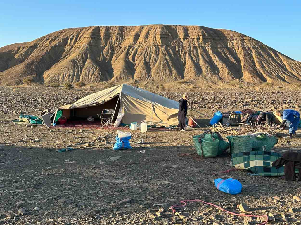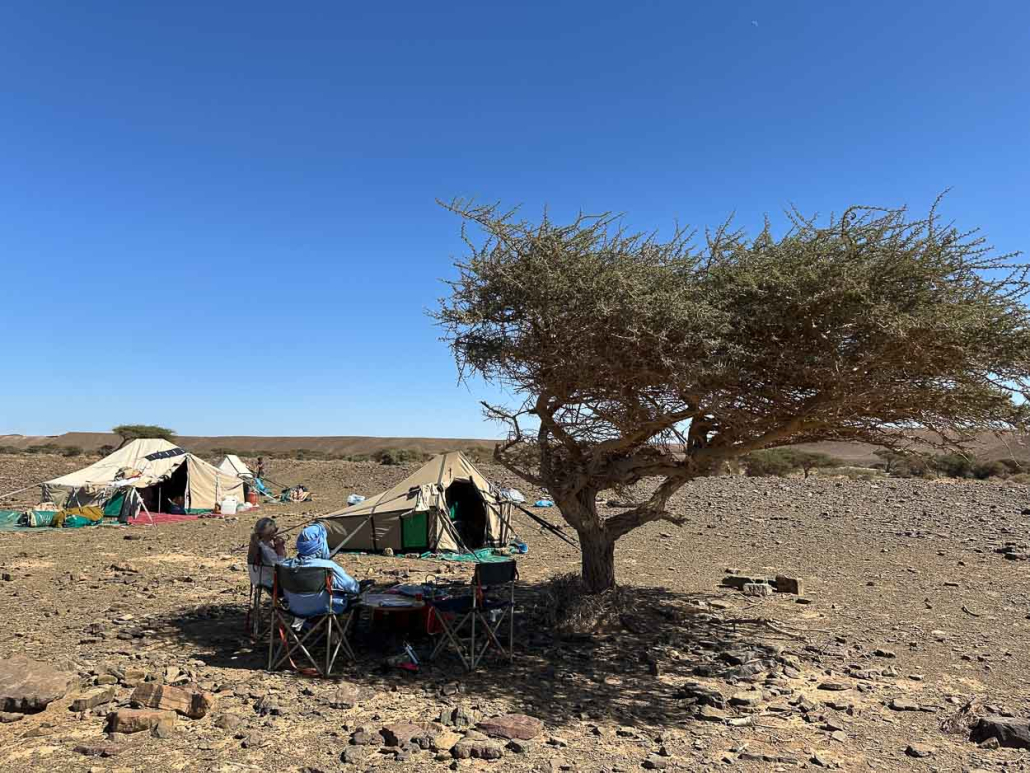 Brahim et Nicolas sont partis en amont de l’oued avec un dromadaire et deux bidons, les acacias entièrement verts indiquent qu’il est possible que s’y trouve un puits. Ils reviennent avec de l’eau légèrement salée, puisée à six – sept mètres.