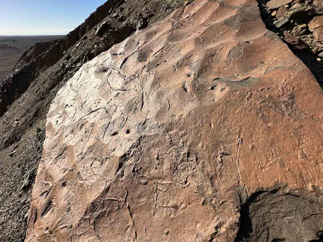 Fin d’après-midi j’aime marcher, grimper une colline, un sommet et je choisi cette montagne érodée qui domine le bivouac, la pente est raide et compact, des dalles de fossiles divers sont comme posés sur la pente et me transporte à une époque des fonds marins.