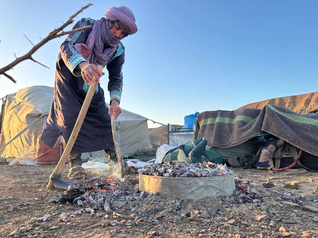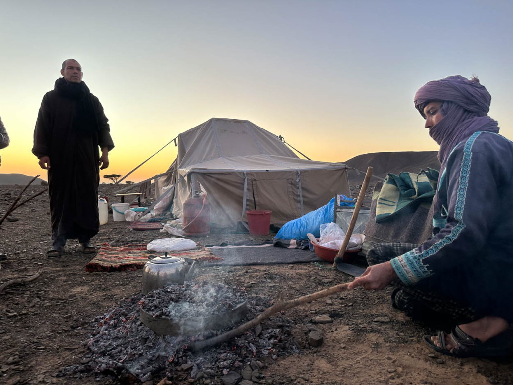 Idir à préparer une grande bassine de pâte pour le pain qui sera cuit avec le bois sec d’acacias dans un four combiné de braises et recouvert d’un fond de bidon en tôle dans lequel un des chameaux mange quotidiennement son orge), et qui pour l’occasion nous sert de four. L’un des deux pains sera fourré avec de la graisse qu’Idir à prit soin de saler au dernier ravitaillement pour la conserver. À cette graisse il ajoute des oignons, du poivron, le tout macéré dans une sauce à base d’huile d’olive et divers épices, cumin et piment.