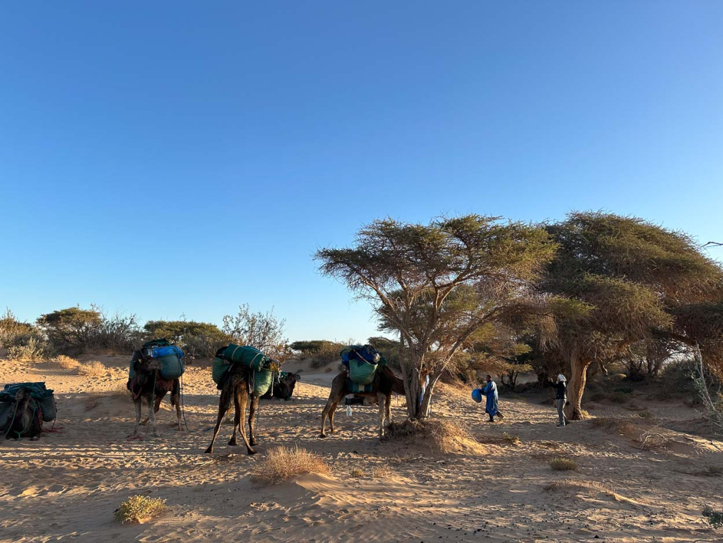 Quelques kilomètres pour atteindre le centre de Haouza matérialisé avec divers bâtiments administratifs, boutiques du désert et des campements nomades avec enclos de chamelles et chamelons. Nous faisons halte dans l’une de ces boutiques, et au lieu de commander des boissons gazeuses, nous commandons quelques verres de lait frais de chamelles, trait ce matin, sortie du frigo. Quel délice ce lait encore mousseux et léger ! Nous en emporterons un bidon de cinq litres pour ce soir pour le partager avec toute l’équipe friands de cette boisson saharienne nutritive.