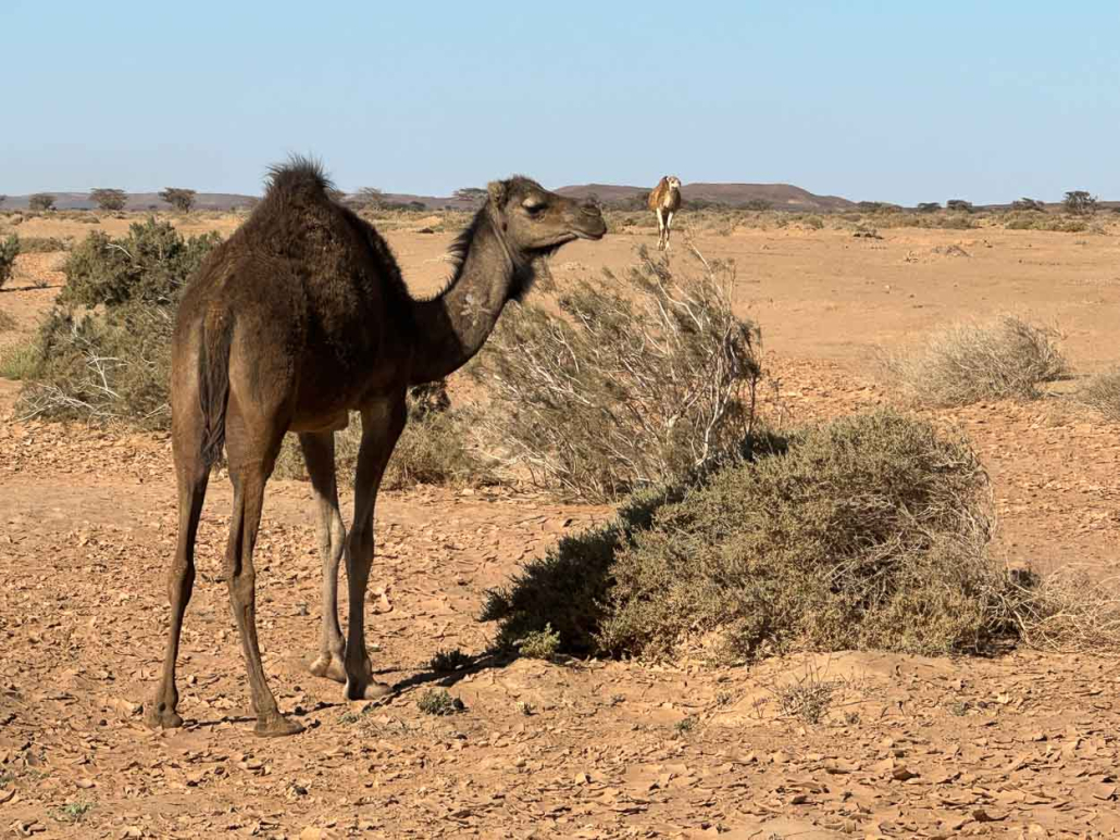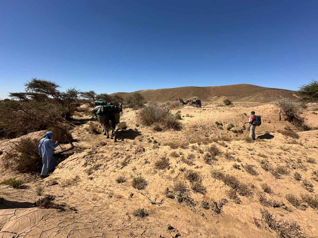 La caravane se faufile au travers la plaine brûlée de la Saguia. Les ombres s’étirent devant nous, les rayons du soleil passent entre nos pats. Le sol est noueux, creusé par l’érosion de l’eau qui s’est écoulée. L’argile en séchant, à figé les contours comme les poteries de Tamgrout qui se déshydratent au soleil avant la cuisson. Les herbes sèches sont tranchantes, les racines des arbustes sortent du sol, la marche demande de la vigilance.