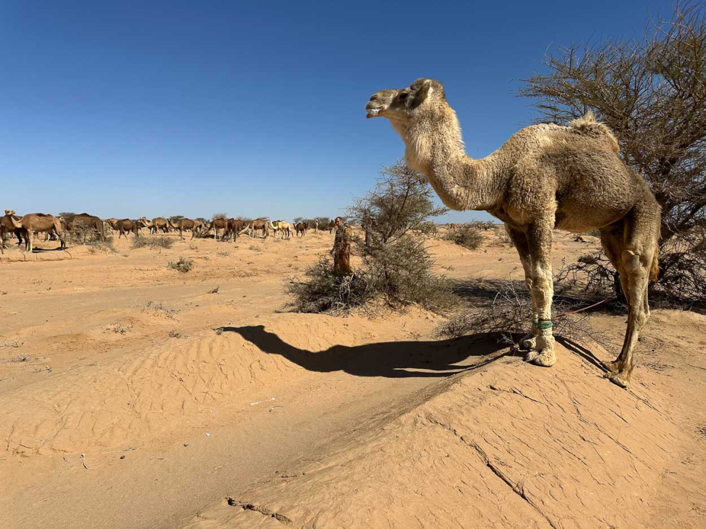 Idir et Rachid lâchent leur bout de « mellah » dans la main et courent vers nos chameaux au milieu de l’oued en pâturage dans les acacias, pour éviter qu’ils s’échappent vers ce grand troupeau de chamelles.