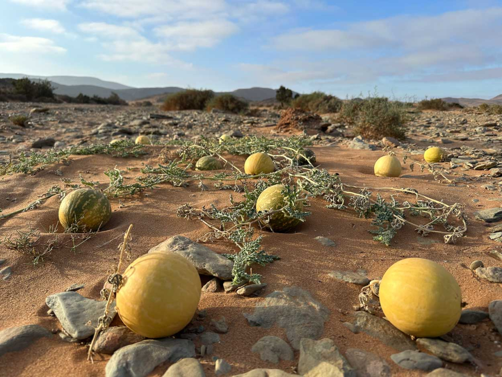 Quelques coloquintes (sorte de courge toxique, rondes diamètres de quinze centimètres), signe qu’il a quand même plu un peu.