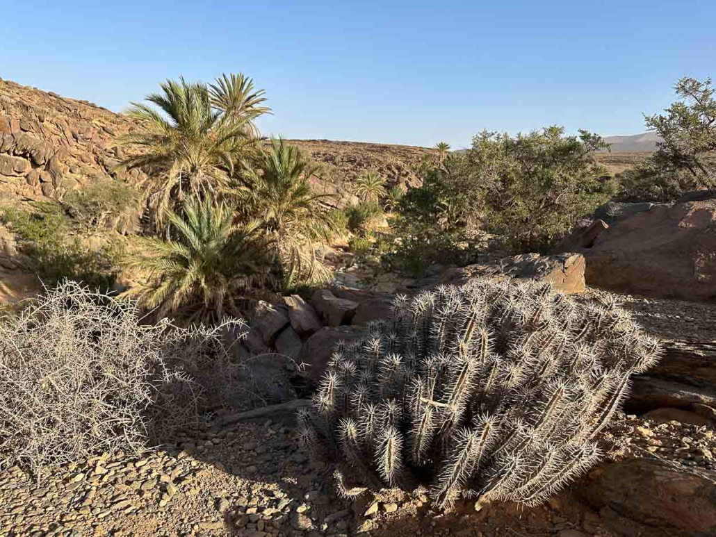 Le bivouac se trouve juste au bord du plateau, au dessus d’une gorge, l’oued Elgadroure. L’eau ne coule pas mais la végétation est présente, de très anciens arganiers à côté d’un puits en eau clair à trois mètres. Les palmes séchées des palmiers s’agitent avec le vent, des lauriers-roses bordent le pied des roches polies de l’oued.